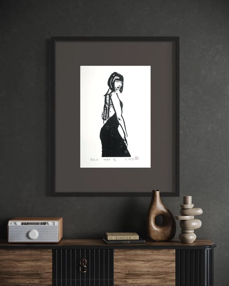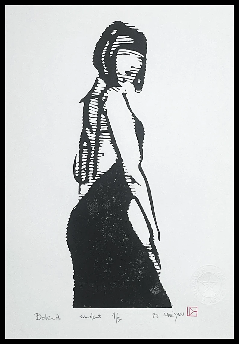 Behind – Original handmade woodcut print – Contemporary art – Wall decor. Hand-made by IndriYanArtFactory, Materials: Schmincke black ink, Width: 29.7 centimeters, Height: 42 centimeters. Title: Behind, Year: 2023, Size: 29.7 x 42 cm, Numbered