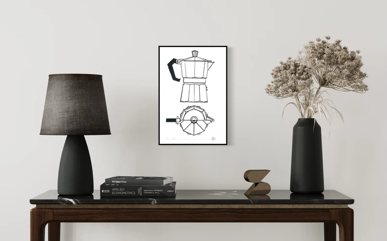 When the artist was a child, his mother made coffee at home with a similar coffee maker that made great espresso. Back then he hated coffee because of its bitter taste, later as an adult, he fell in love with it, and found this to be the best small coffee maker at home. Simple, yet great. However, its iconic 90-year-old shape has captivated millions of people.